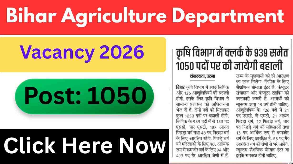 Bihar Agriculture Department Vaccancy 2026: नमस्कार साथियों आज हम बात करेंगे बिहार कृषि विभाग में निकली बंपर बहाली। बिहार में सरकारी नौकरी की तैयारी करने वाले युवाओं के लिए बड़ी खुशखबरी सामने आई है। बिहार कृषि विभाग (Bihar Agriculture Department) में Cleark और Stenoghrapher के कुल 1050 पदों पर बहाली प्रक्रिया शुरू के दिया गया है। इस भर्ती का युवा काफी लंबे समय से इंतजार कर रहे थे।