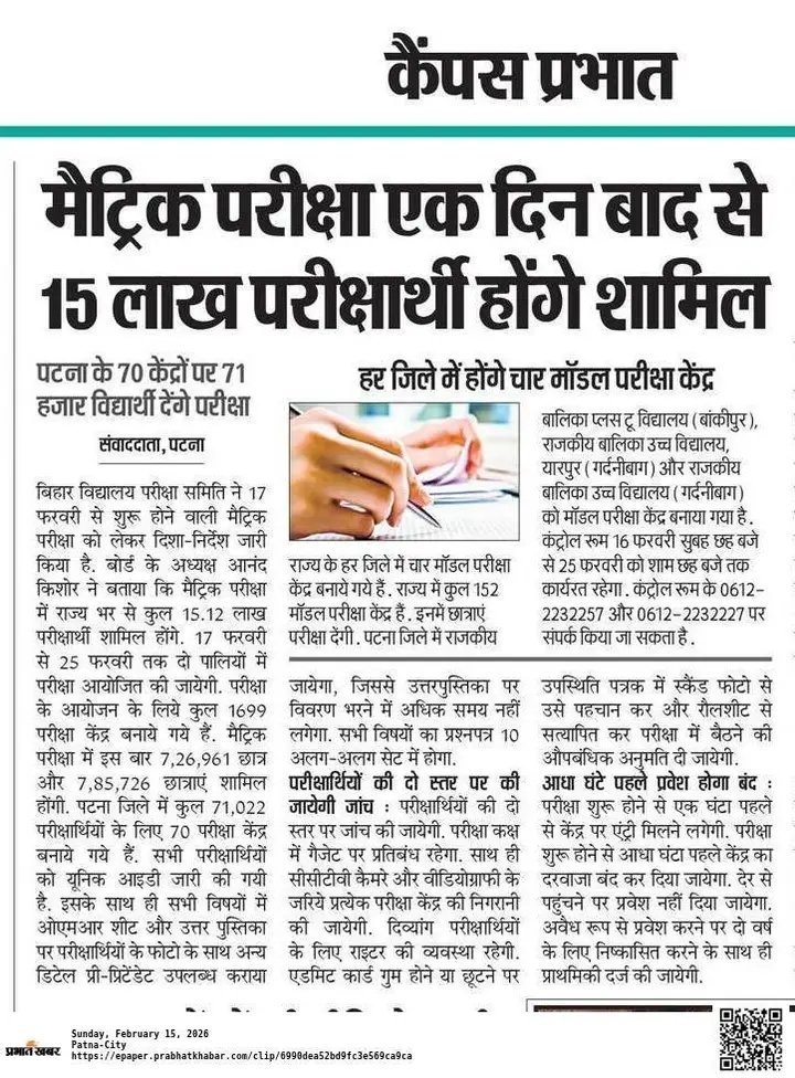 बिहार बोर्ड मैट्रिक परीक्षा 2026 आपके जीवन की परीक्षा है, जो आपके भविष्य को उज्जवल बनाने की शुरुआत करेगा। Bihar School Examination Board के द्वारा की गई बेहतर व्यवस्था, 1699 परीक्षा केंद्रों पर यह परीक्षा आयोजित कराई जाएगी।