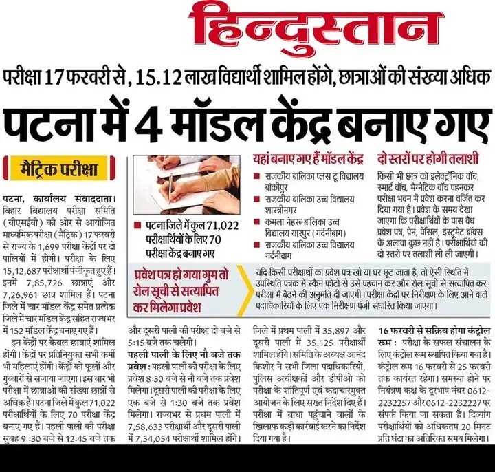 बिहार में आयोजित मैट्रिक की परीक्षा 17 फरवरी से राज्य के 1699 परीक्षा केंद्रों पर दो पालियों में कराई जाएगी, जिसमें कुल छात्राएं 7,85,726 और छात्र 7,26,961 शामिल होंगे।
