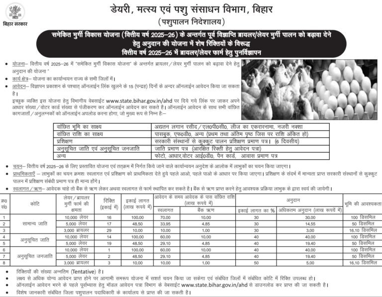 Bihar Poultry Farm Yojana 2026 बिहार सरकार की एक महत्वपूर्ण योजना है जिसका उद्देश्य बिहार में मुर्गी पालन को बढ़ावा देना और ग्रामीण क्षेत्र में स्वरोजगार उत्पन्न करना। इस योजना के जरिए किसानों और युवाओं को ब्रॉयलर और लेयर पोल्ट्री फार्म खोलने के लिए आर्थिक सहायता और सब्सिडी दी जाती है। इस योजना का लक्ष्य यह है कि अधिक से अधिक ग्रामीण क्षेत्रों में लोगों को स्वरोजगार मिले और राज्य में अंडा एवं चिकन के उत्पादन में बढ़ोतरी हो सके।