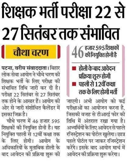 Bihar Teacher Recruitment 2026; चौथे चरण की परीक्षा 22 से 27 सितम्बर तक, आवेदन होली बाद