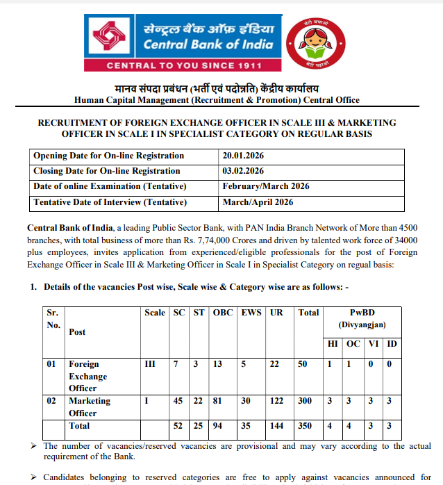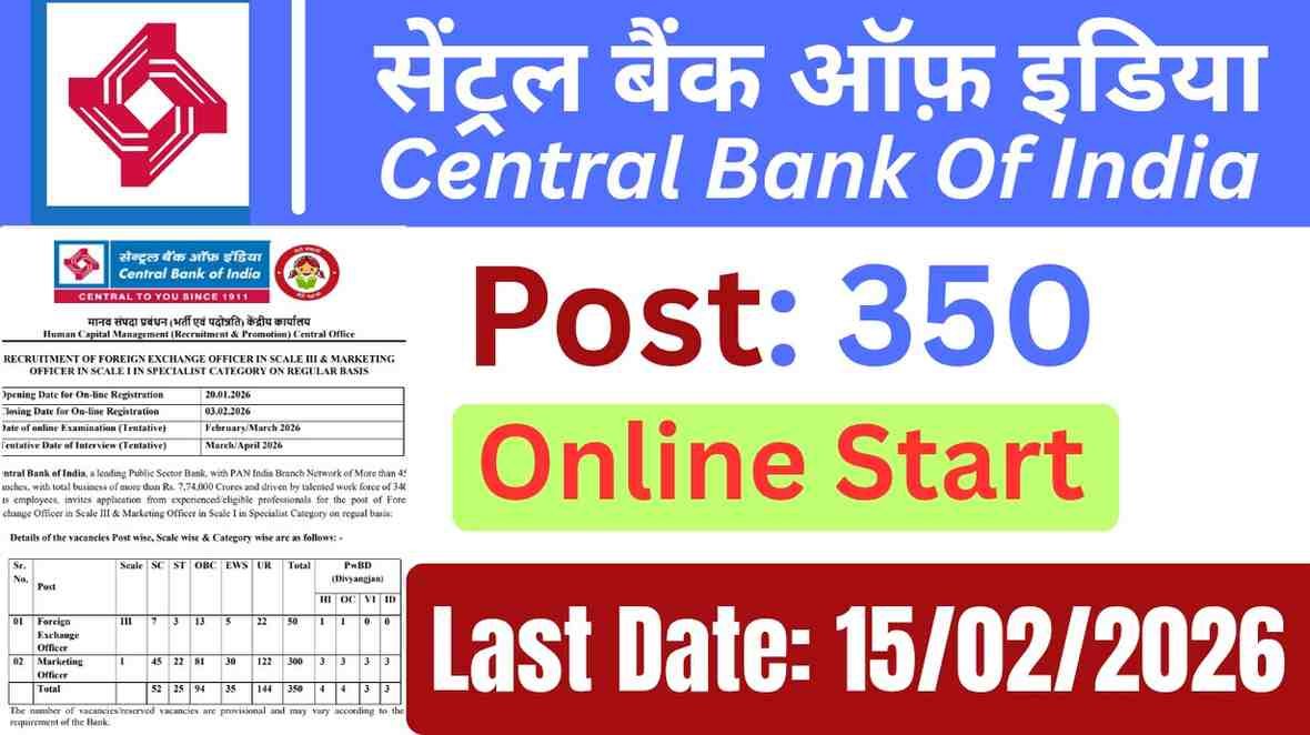 Central Bank Specialist Officer Recruitment 2026: युवाओं के लिए बैंक में सरकारी नौकरी करने का बड़ा मौका सामने आया है। सेंट्रल बैंक ऑफ़ इडिया ने स्पेशलिस्ट ऑफिसर के 350 पदो पर निकली भर्ती, जिसकी अंतिम तारीख 15 फरवरी 2026 तक राखी गई है। अगर आप किसी बैंक में सरकारी नौकरी करने का सपना देख रहे है तो यह लेख आपके लिए बेहद शानदार होगा।