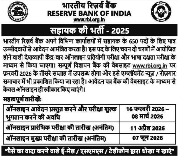 Reserve Bank of India (RBI) ने Assistant पदों के लिए 650 रिक्तियां निकली है। इस भर्ती के माध्यम से देशभर के विभिन्न RBI कार्यालयों में योग्य उम्मीदवार की बहाली की जाएगी। RBI Assistant Apply 2026 के लिए आवेदन करने की प्रक्रिया आज से शुरू कर दी गई है जो आवेदन करने की अंतिम तारीख 08 मार्च 2026 तक ही रखा गया है।